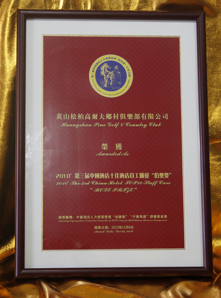 黃山高爾夫榮獲2010中國酒店十佳酒店員工關(guān)愛“伯樂獎(jiǎng)”