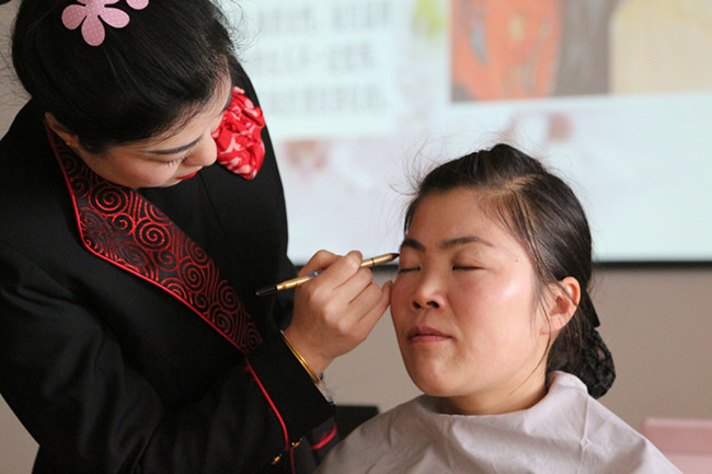 培訓(xùn)課程一開(kāi)始,百大美麗課堂的老師從娛樂(lè)圈女星妝前妝后的對(duì)比照,直接明了的讓大家知道化妝不僅能改善面部膚色,還能瞬間提升整體魅力?;瘖y課程正式開(kāi)始后,老師邀請(qǐng)一位員工上前,從基礎(chǔ)的護(hù)膚開(kāi)始,邊操作邊為大家解說(shuō)護(hù)膚的步驟。隨后,開(kāi)始彩妝學(xué)習(xí),由眉毛開(kāi)始一直到嘴唇,細(xì)致入微的介紹,讓大家很快的掌握并明白彩妝化妝技巧。